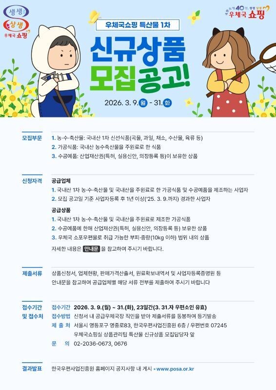 신청을 원하는 사업자는 우체국쇼핑몰(mall.epost.kr) 또는 한국우편사업진흥원 홈페이지(posa.or.kr)에 게시된 특산물 신규상품 모집 공고를 확인한 후, 첨부된 신청 양식을 작성하여 관련 서류와 함께 3월 31일까지 우편으로 제출하면 된다.